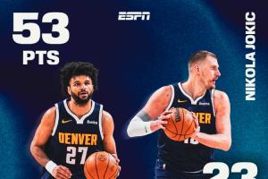 约基奇出战38分钟,投篮19中8,三分5中1,罚球6中6,砍下23分21篮板19助攻1抢断。